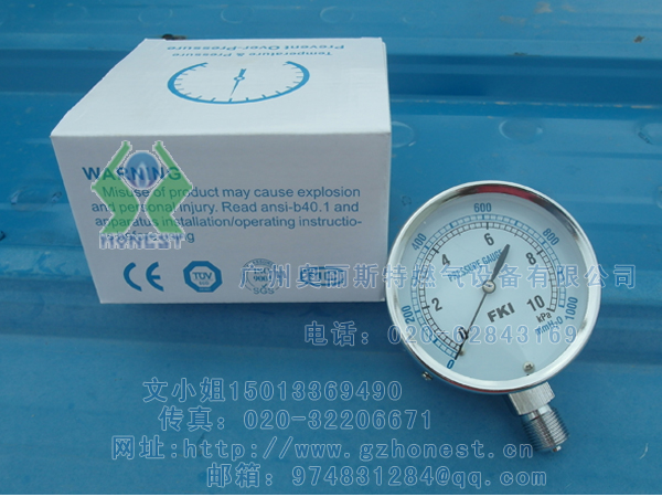 臺灣FKI壓力表中國總代理,廣州奧麗斯特燃氣設備有限公司Company Name:Guangzhou honest Gas Equipment Co., LTD.文奕零二零捌二一柒捌柒伍叁(15013369490文)代理銷售臺灣FKI集團生產的微壓表,產品精度高,計量準確、外觀美觀大方。微壓表結構原理:微壓表由測量系統包括接頭、波紋膜盒等、傳動機構(包括撥桿機構、齒輪傳動基于波紋膜盒在被測介質的壓力作用下,其自由端產生相應的彈性變形,再經齒輪傳動機構的轉動并放大,由固定于齒輪軸上的指針逐將被測值在度盤上指示出來,能有效防止過壓造成儀表損壞而帶來燃燒不穩定、設備故障的嚴重影響,該表不僅具有過壓防止作用,還設有調零裝置,能有效保證壓力表在各個地域能安全使用、隨時校零。